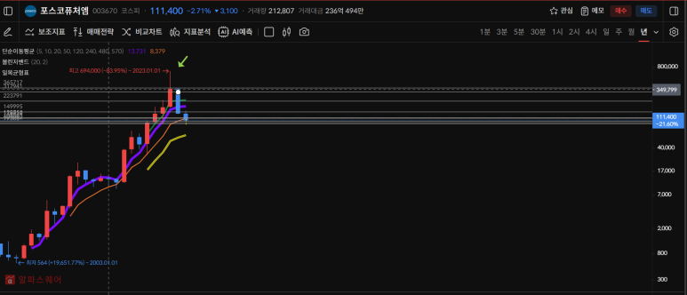 20년 46000원으로 시작했고 23년 694000원으로 마감하기까지 1100%의 경이로운 상승을 보였다.