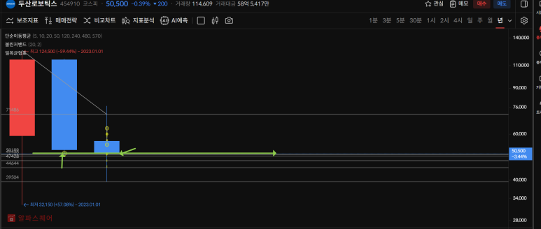 현재 로봇주 테마에 힘입어 기대감이 작용해서 상승과하락을 반복하고 있는 것이다.